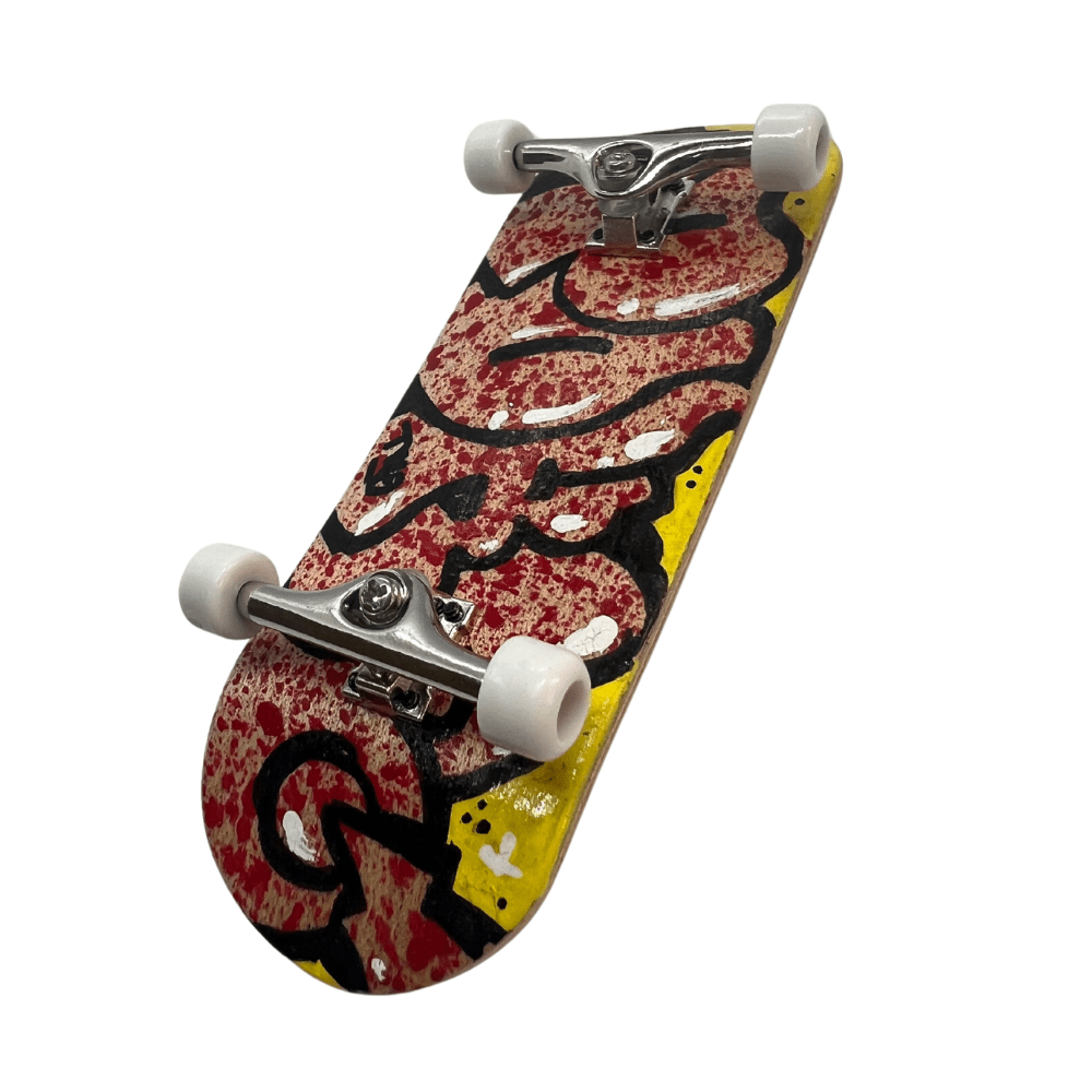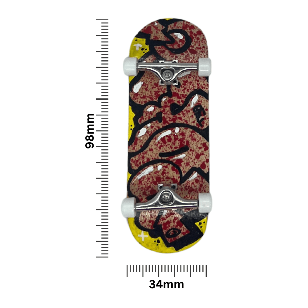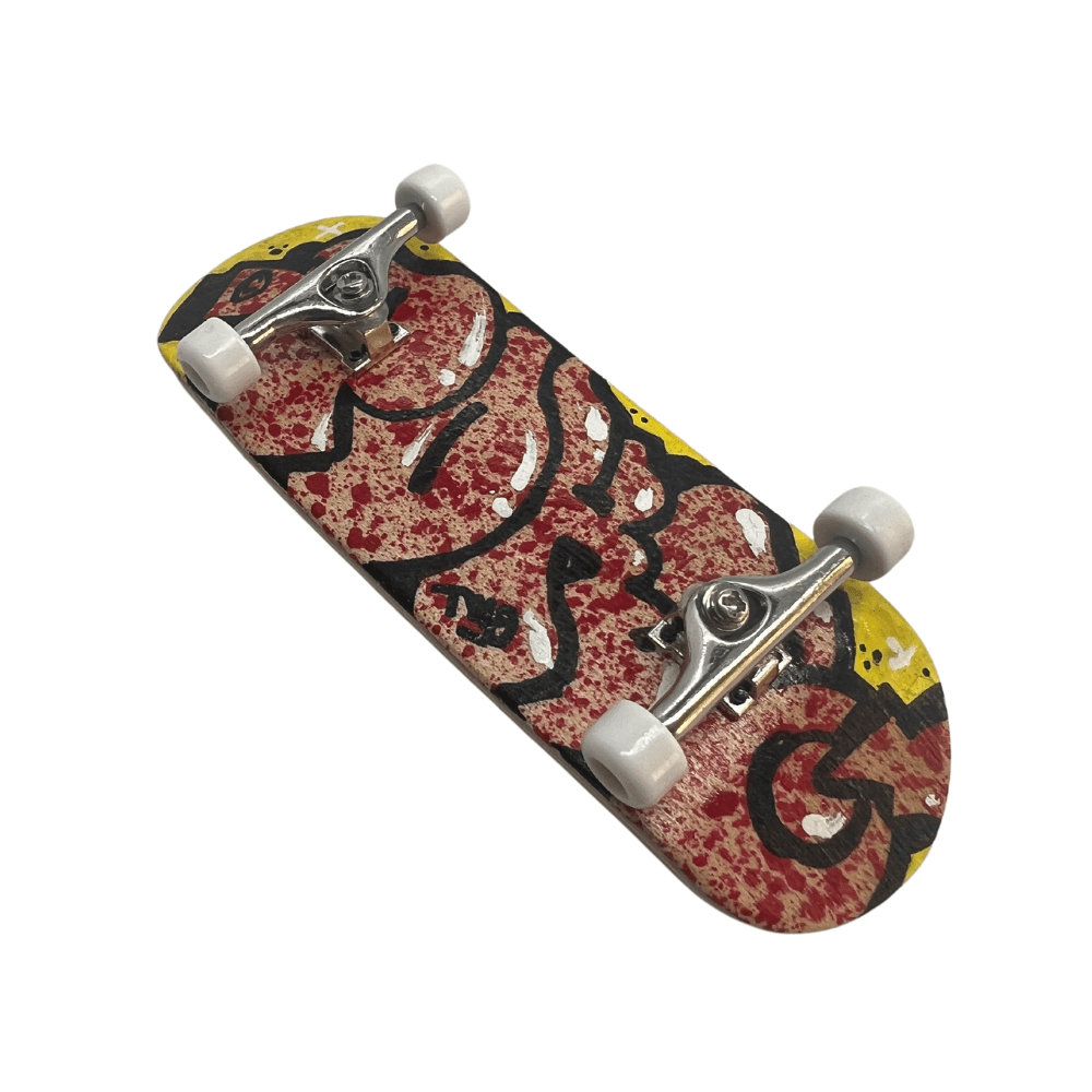 Poke2 artist handmade professional fingerboard 34mm x 98mm complete with steel trucks and bearing wheels hand painted with original art.