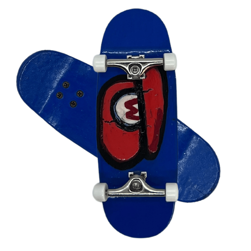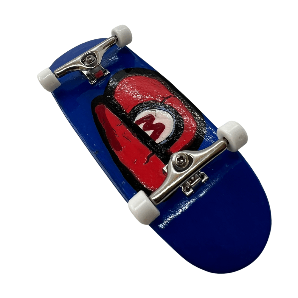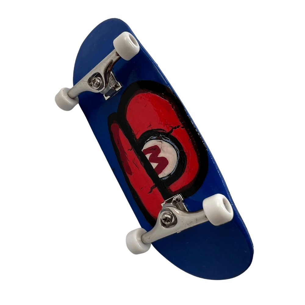 ‘Cracking M’ Artist Professional Handmade Fingerboard 33mm x 100mm complete with steel trucks and urethane bearing wheels and hand painted design on deck.