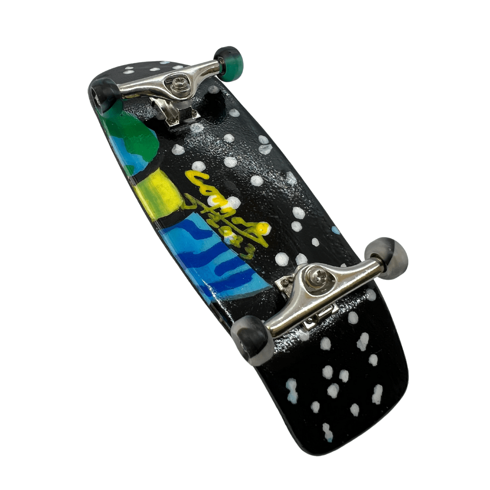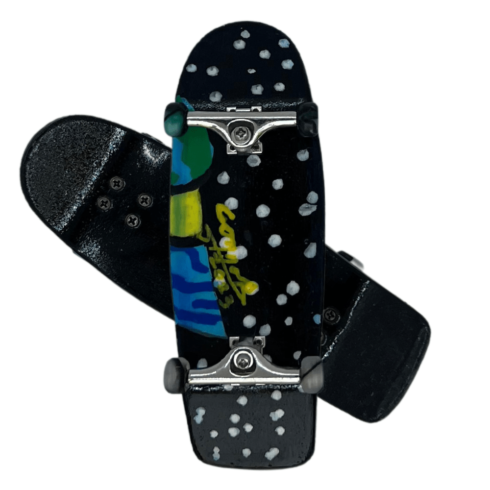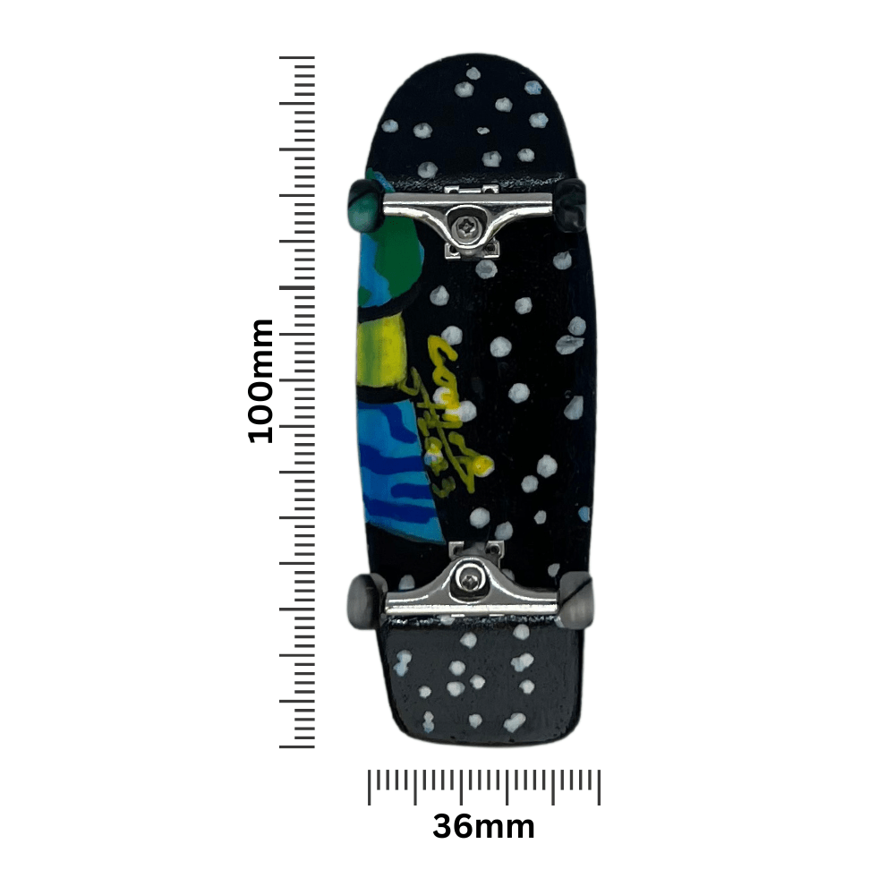‘A Peek of the Universe’ artist handmade professional fingerboard 36mm x 100mm complete with steel trucks and special limited edition swirl urethane bearing wheels hand painted with signed original art. This fingerboard includes a Certificate of Authenticity.