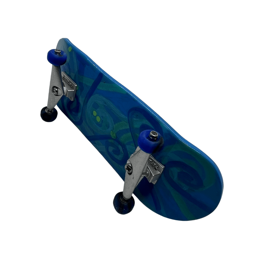 ‘Deep Blue Sea’ artist handmade professional fingerboard 33mm x 97mm complete with steel trucks and special limited edition swirl fiberglass bearing wheels hand painted with original art.