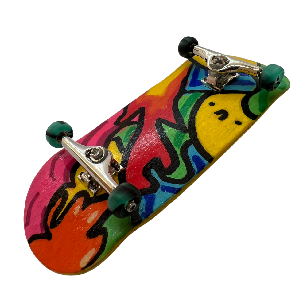 ‘I Belong’ artist handmade professional fingerboard 35.5mm x 98.5mm complete with steel trucks and special limited edition swirl urethane bearing wheels hand painted with original art.