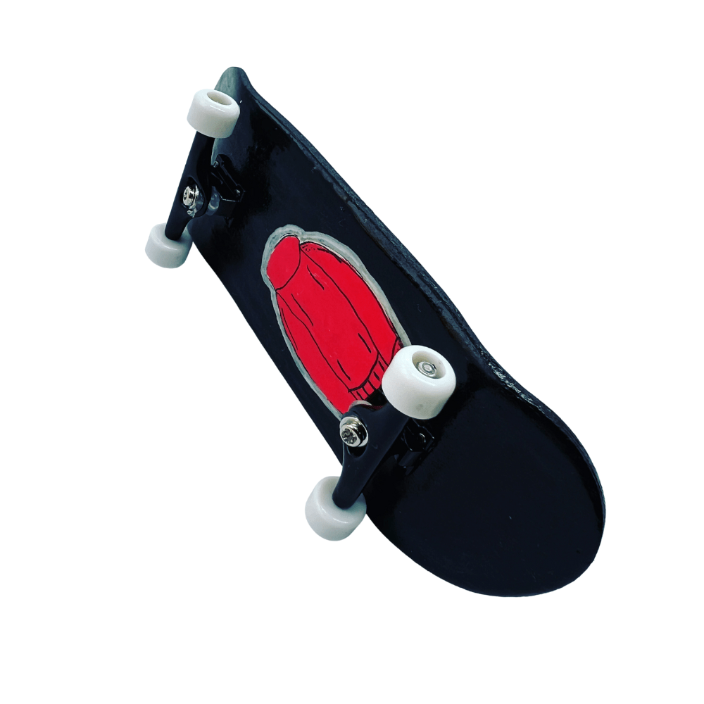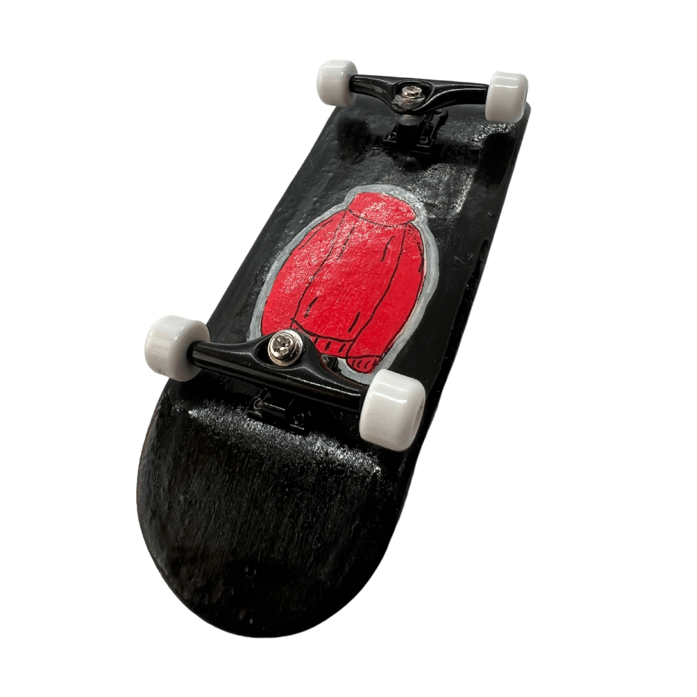 ‘Red Jumper’ Artist Professional Handmade Fingerboard 35mm x 100mm complete with steel trucks and urethane bearing wheels and hand painted original design on deck.