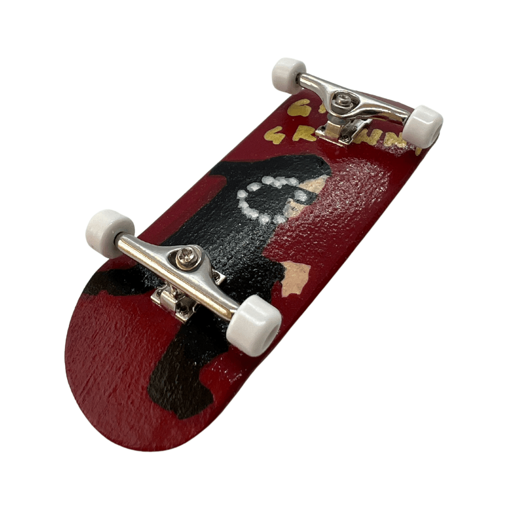 ‘Gangsta Granny’ Artist Professional Handmade Fingerboard 34.5mm x 97.5mm complete with steel trucks and urethane bearing wheels and hand painted design on deck.
